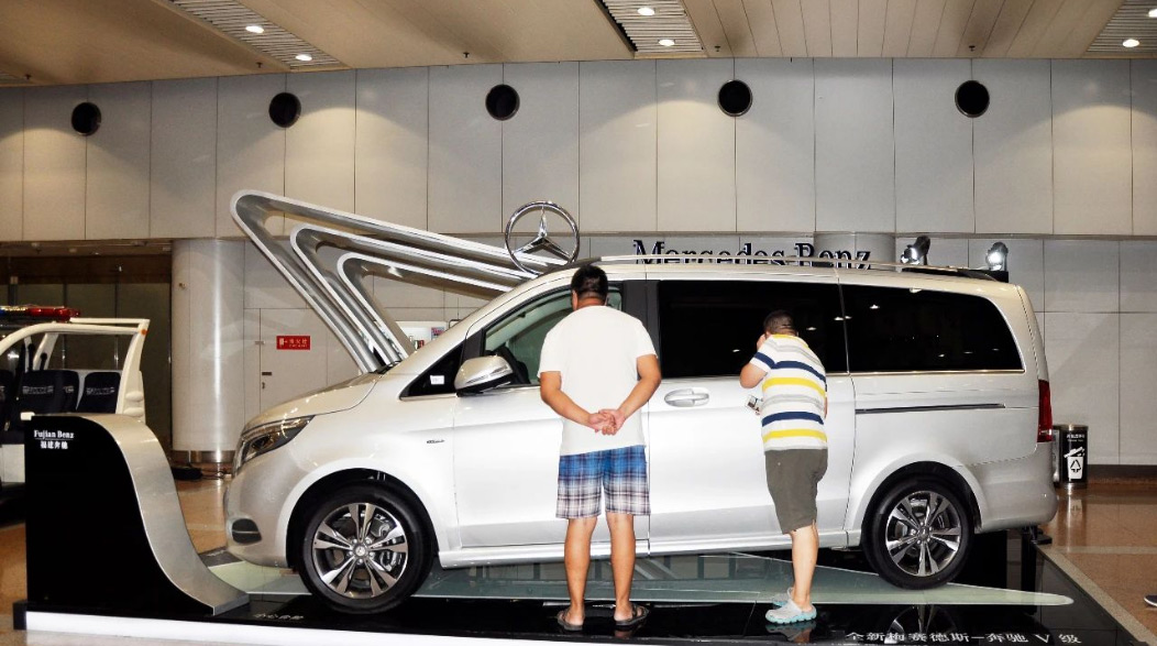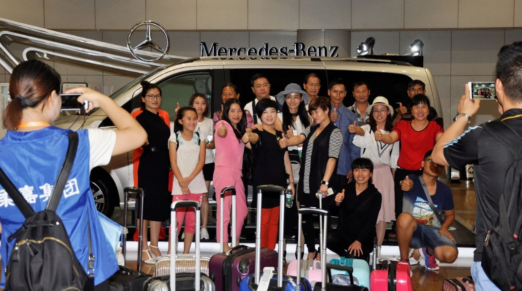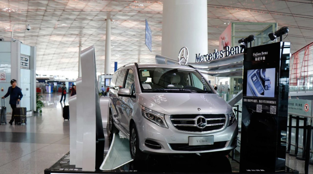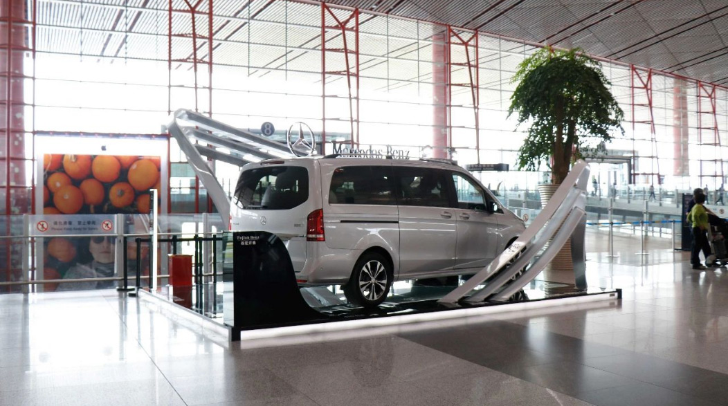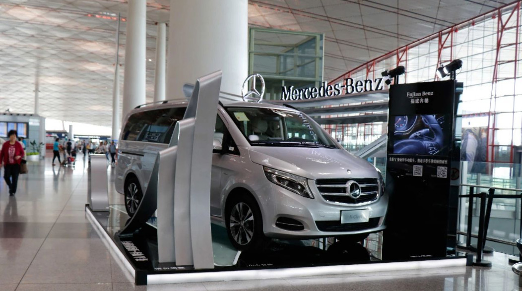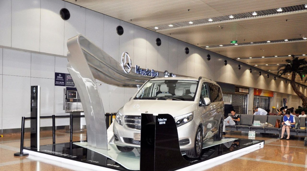 由于張揚向上的造型配上V-CLASS的尊貴車型,使得展位一度成為機場最吸引人的地標。隨后又在T2航站樓到達展位進行二次展示。